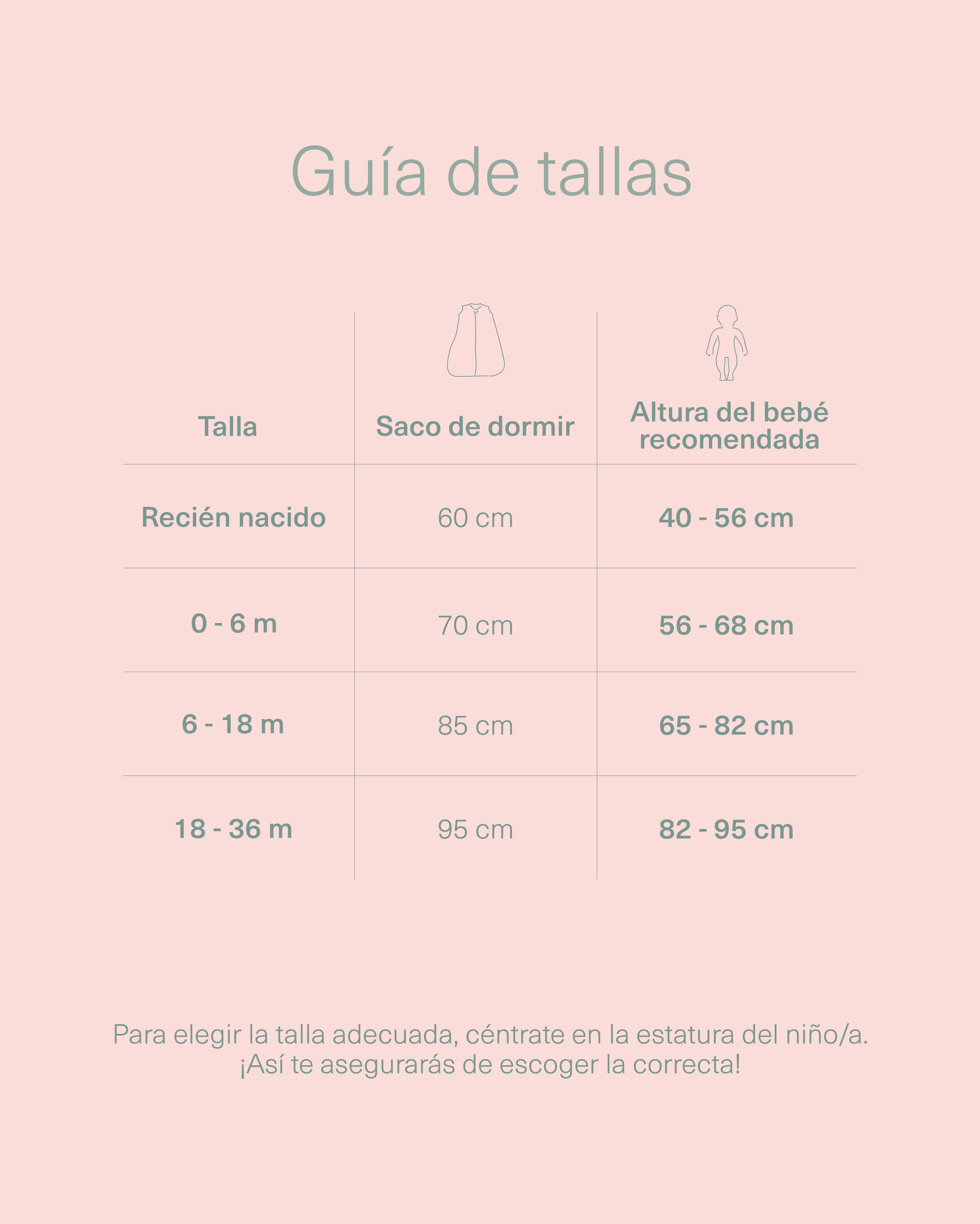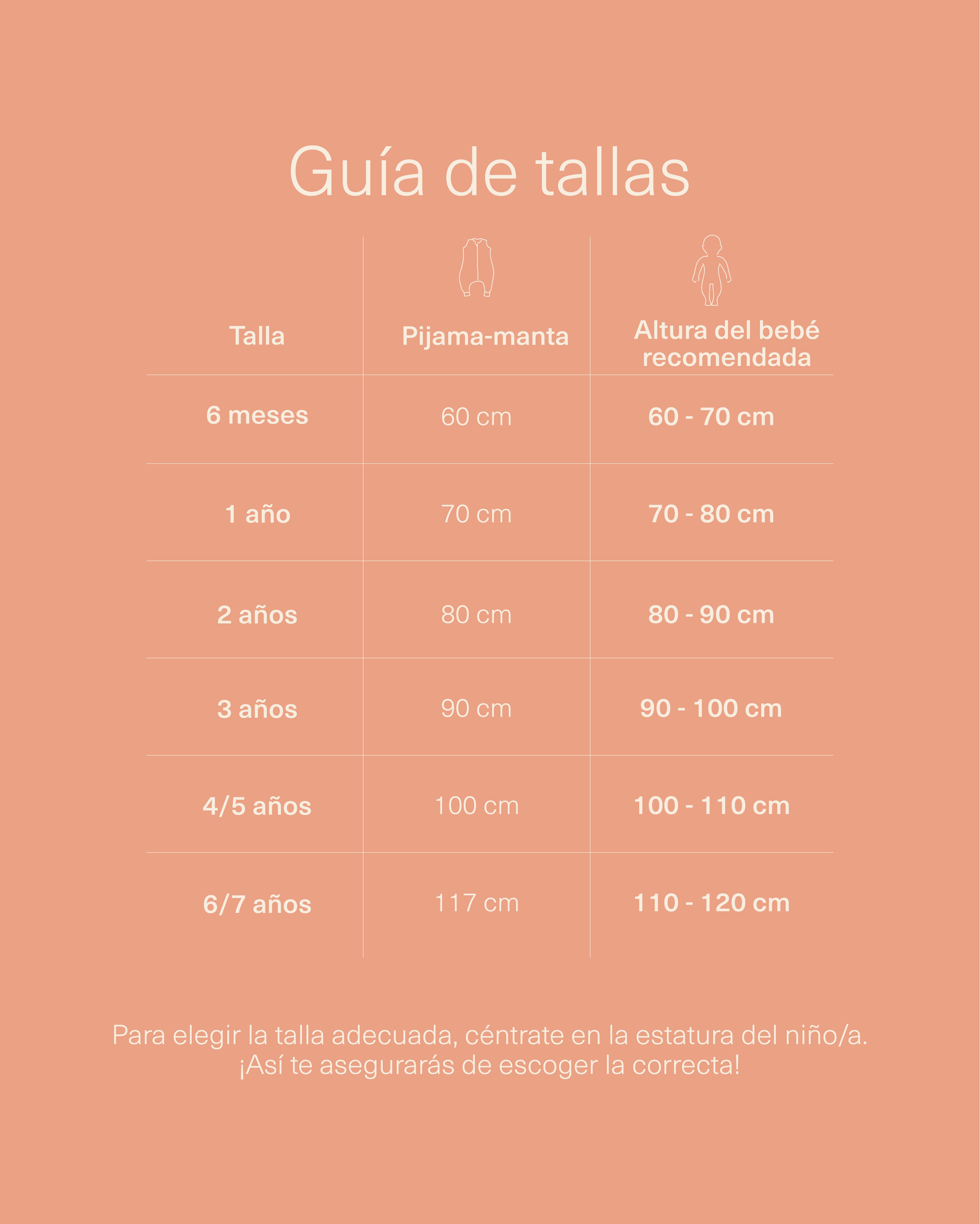 Principalmente, si se duda entre dos tallas, recomendamos basarse en la altura del bebé antes que en la edad. Cada niño/a y cada cuerpo es distinto y no existen unas medidas exactas. Preferimos tallar generoso, por varias razones: para asegurarnos de que a cualquier bebé le vendrá bien, para la comodidad a la hora de dormir y para que dure ese poquito más de tiempo que siempre es necesario.