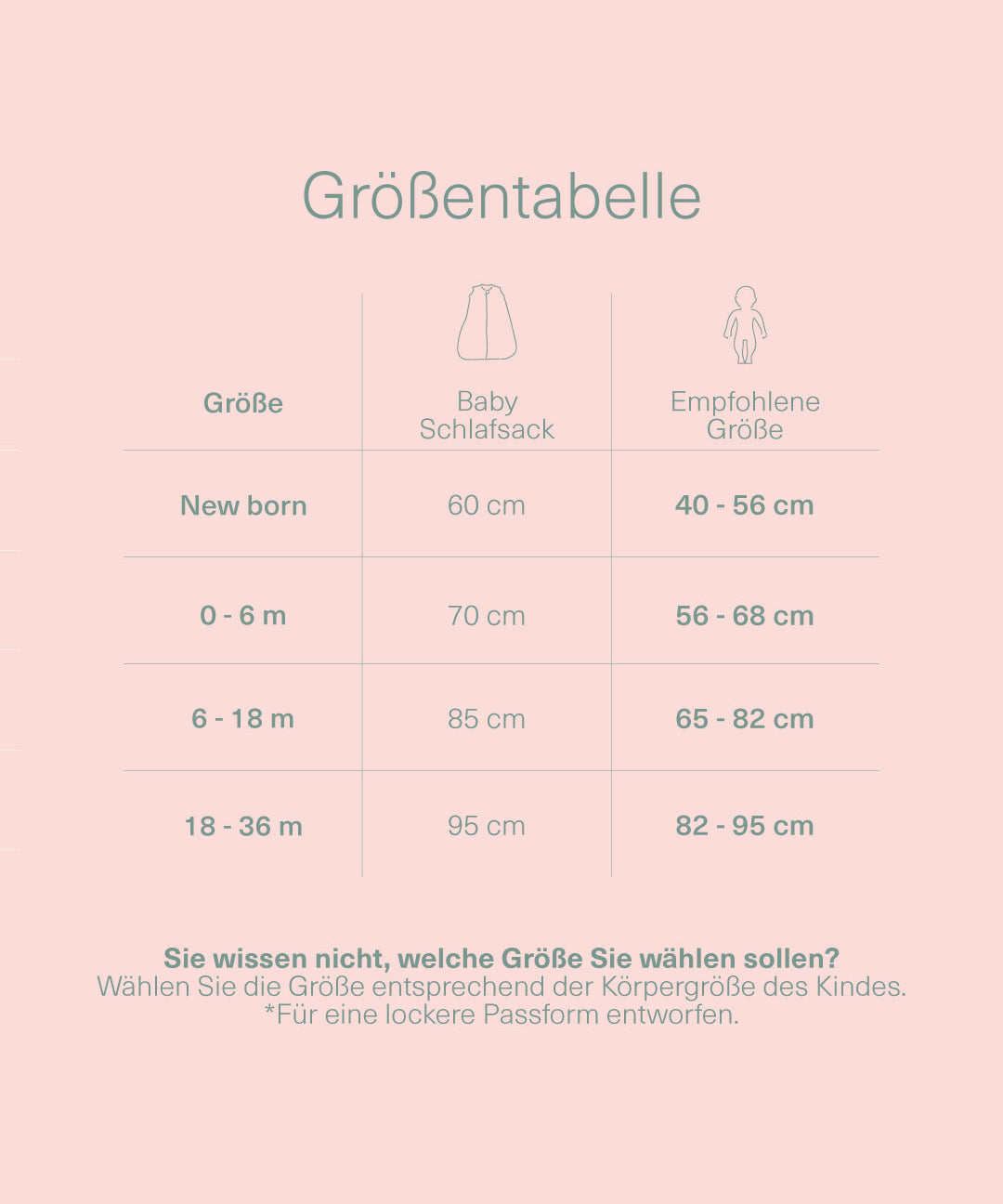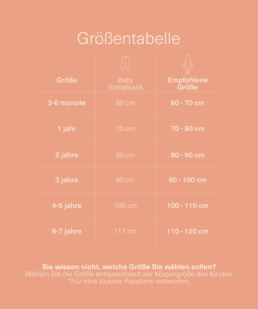 Wenn Sie zwischen zwei Größen unsicher sind, empfehlen wir Ihnen, die Körpergröße des Babys genau zu prüfen. Unsere Taschen passen großzügig hinein.