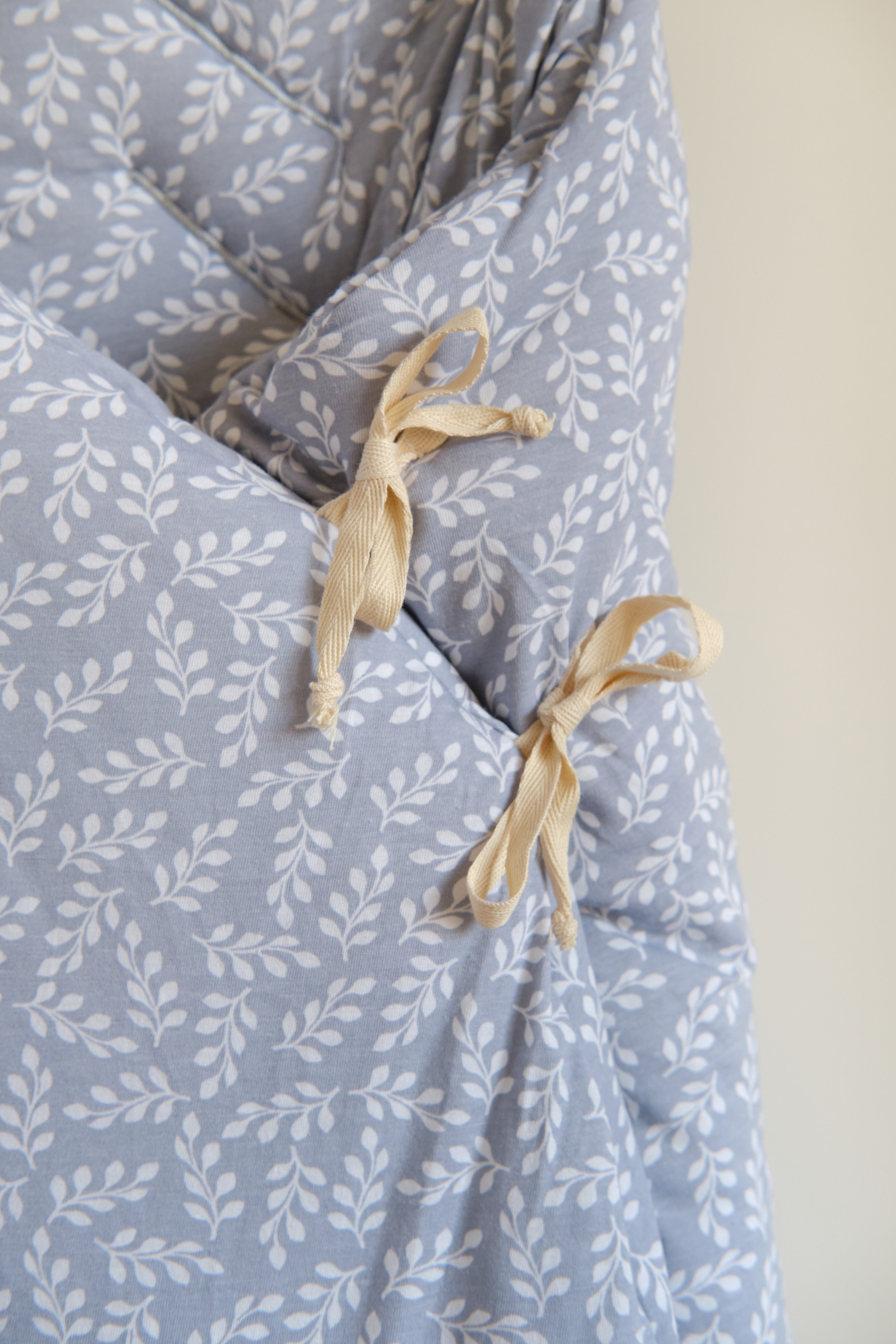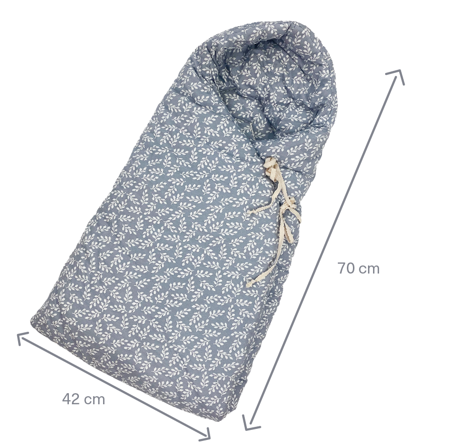 Our bag is designed to be carried inside the carrycot, bassinet, or crib. Its soft double gauze fabric and warm filling maintain the baby’s temperature, protecting him from the cold during the walks and nights. Our bag is closed by two side ties and includes a zipper at the bottom. You will be able to change your baby comfortably and put him inside easily.