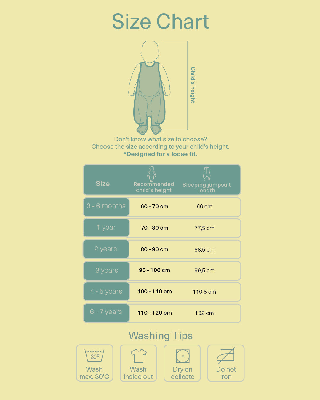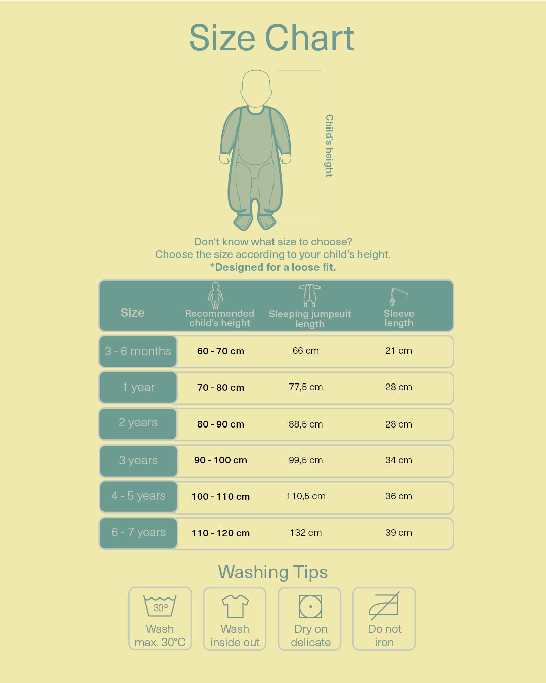 If you're unsure between sizes, we recommend checking your child's height carefully. Our sleeping jumpsuit run generously.