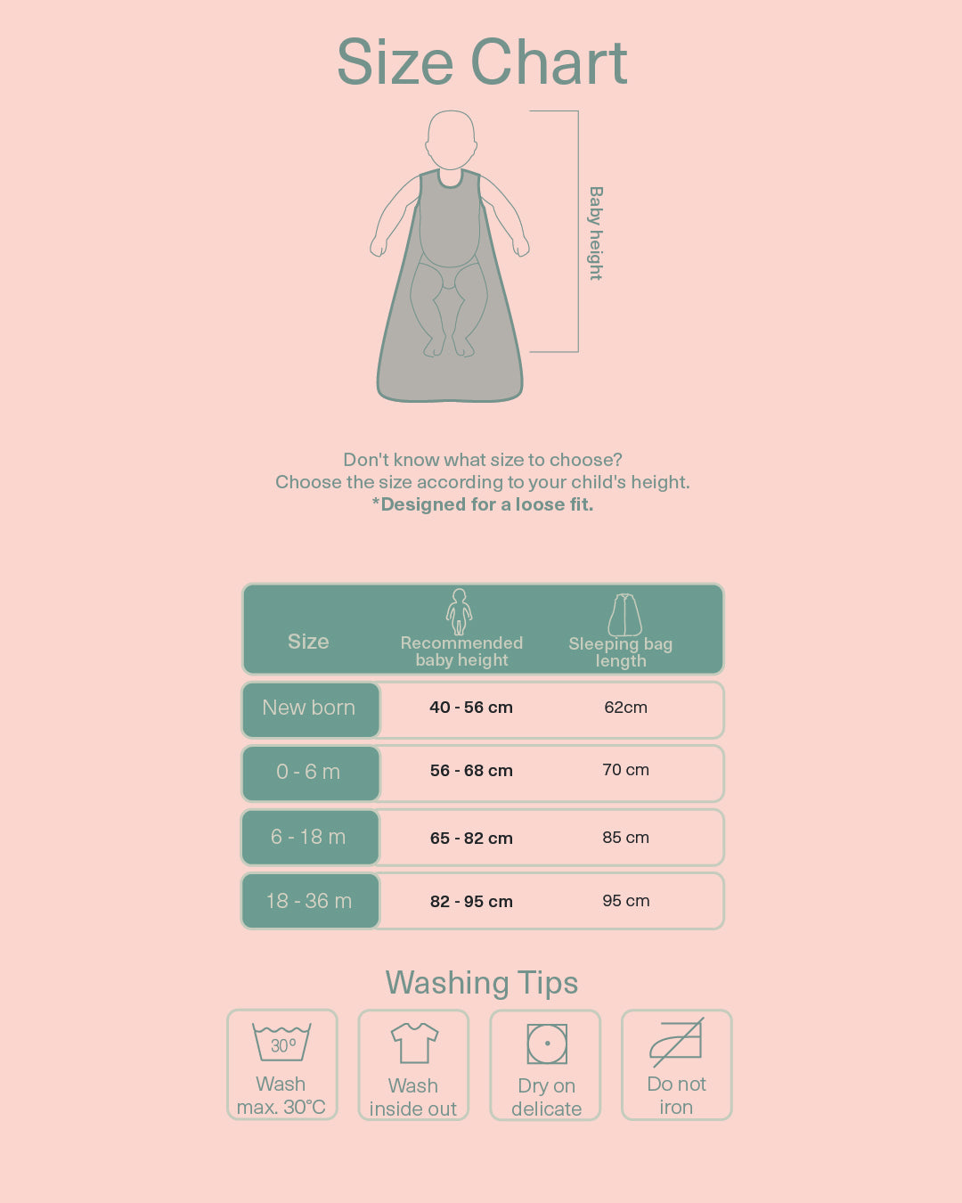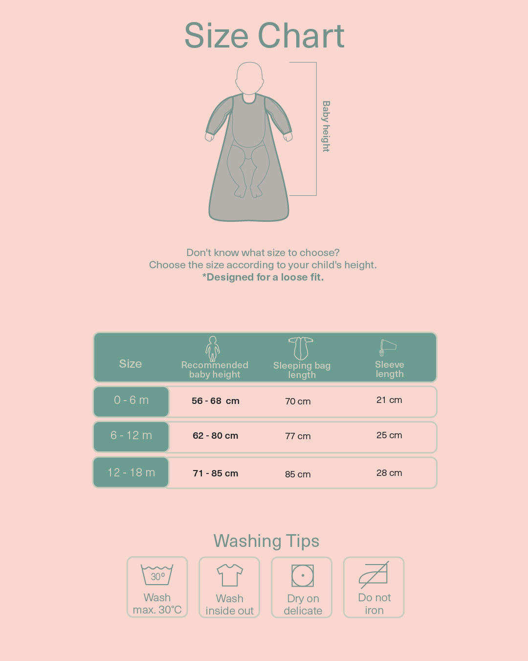 If you're unsure between sizes, we recommend checking your baby's height carefully. Our sleeping bags run generously.