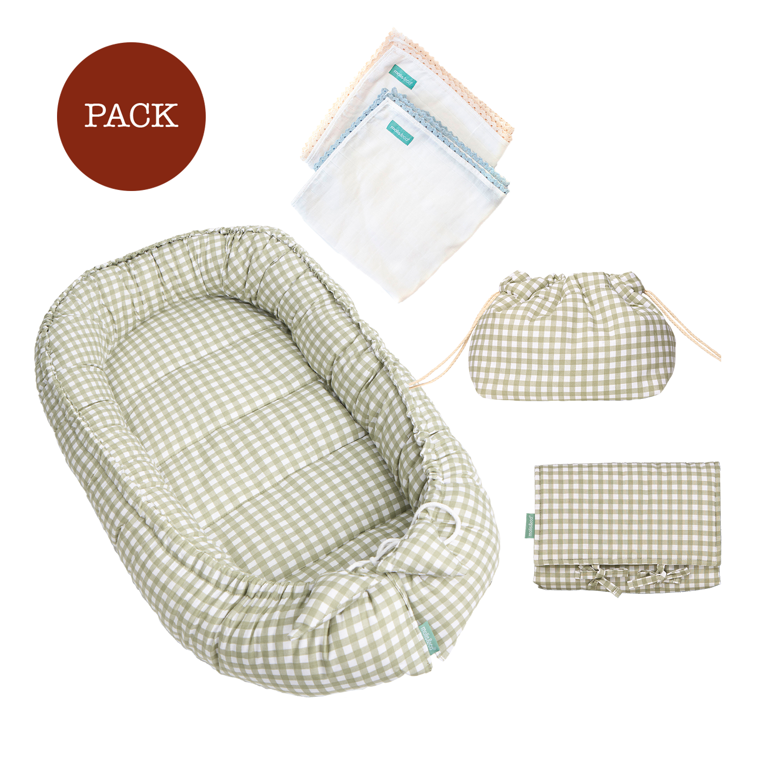 Pack Mint Tea (4 products): Changing mat + newborn nest + organizer + muslin cotton blanket
